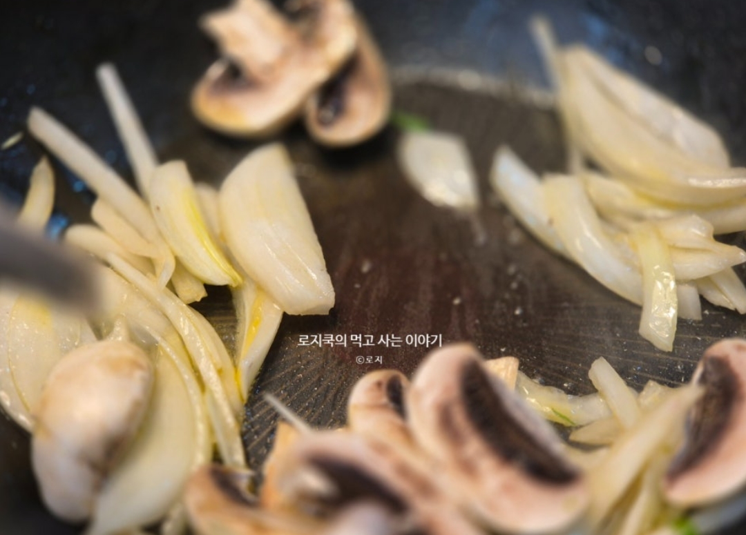 12. 양송이버섯을 넣고 함께 볶아줍니다.