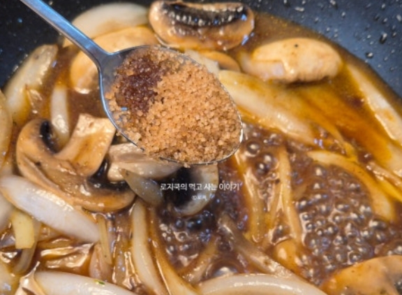 14. 물을 붓고, 설탕, 맛술(미림)을 넣어줍니다. 소스가 걸쭉해질 때까지 끓여줍니다.