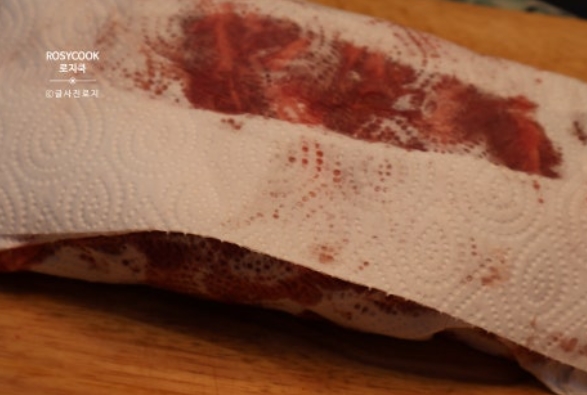 1. 먼저 살치살을 키친타월로 꾹꾹 눌러 핏물을 제거해 줍니다.
