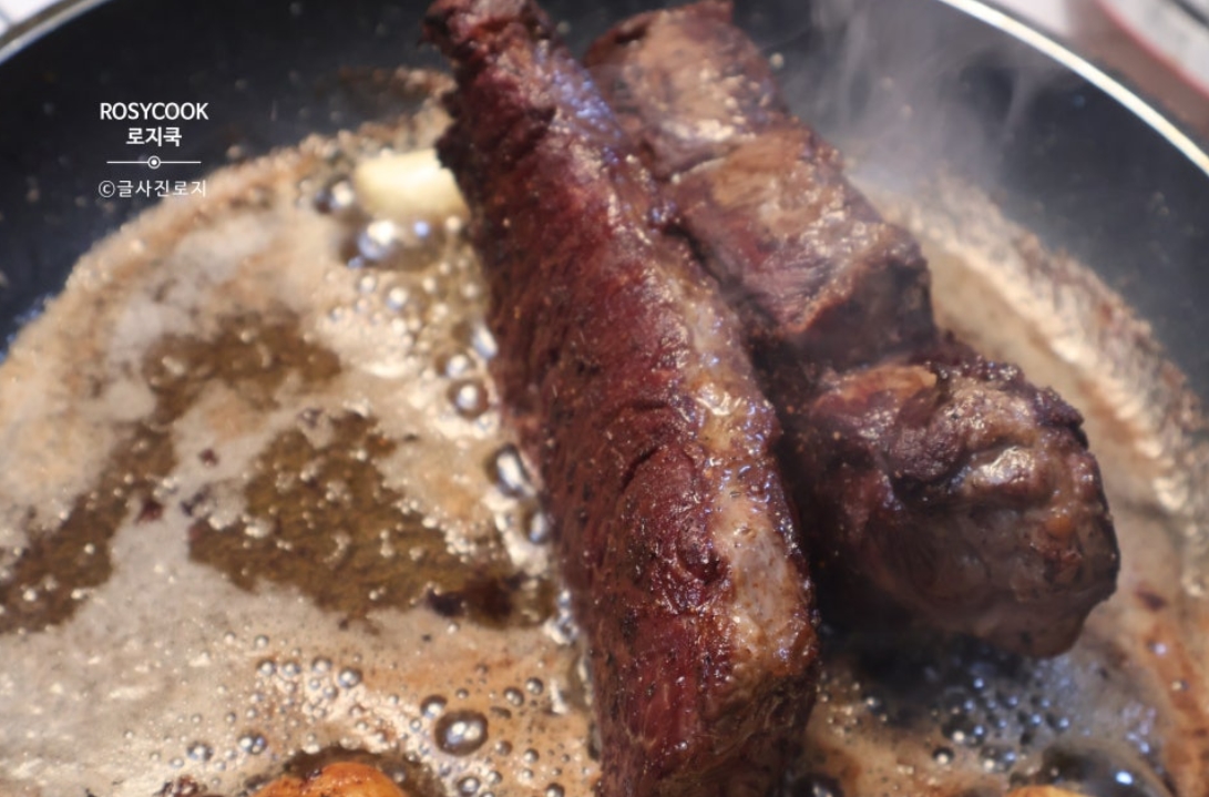11. 세워서 옆면도 구워줍니다. 1분 정도 돌려가며 구웠습니다. 후에 레스팅도 할 것이기 때문에 감안해서 구워줍니다. 레스팅은 고기 중심에 모여있는 수분이 전체적으로 퍼지게 하는 것입니다. 이 과정에서 심부 온도가 올라가기 때문에 고기가 더 익습니다.