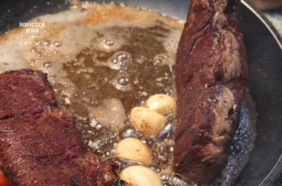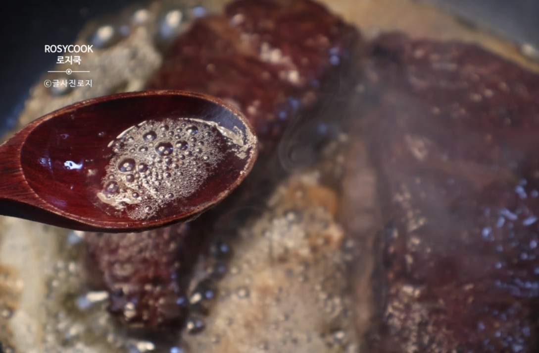 10. 중불로 줄인 후, 버터를 끼얹어가며 구워줍니다. 고기 1덩이 ~ 2덩이 당, 40g ~ 80g 정도 버터를 사용했습니다. 취향껏 양 조절을 해주시면 됩니다. 3 ~ 4분 정도 끼얹어줬습니다. 마찬가지로 사용한 고기의 두께가 더 얇다면 시간을 줄여주시고요. 고기는 익을수록 단단해지기 때문에 눌러보면서 원하시는 굽기로 조절해 주시면 됩니다.