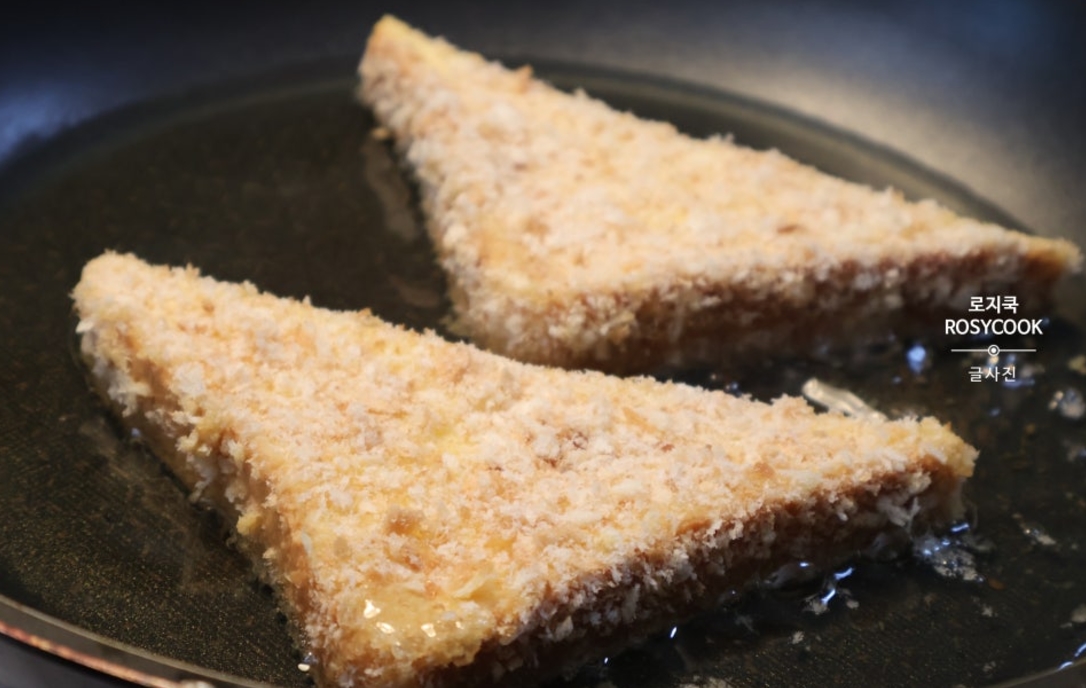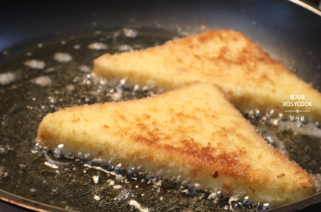 9. 식용유를 넉넉하게 둘러 예열해 준 후, 빵가루를 바른 식빵을 올려줍니다. 170도 ~ 180도 정도에서 튀겨주시면 되고, 식빵을 올렸을 때 지글지글 끓어오르면 적정 온도가 된 것입니다.
