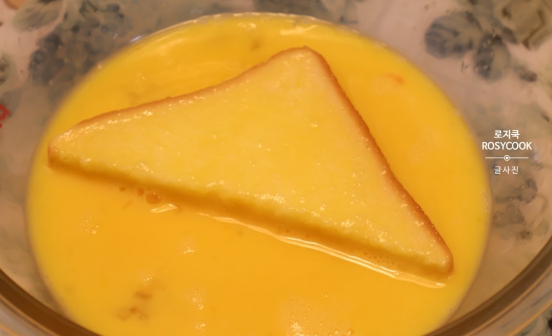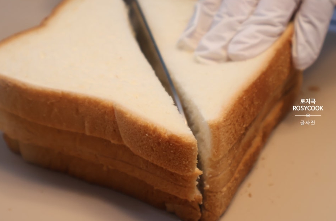 6. 식빵을 삼각형 모양으로 썰어줍니다.