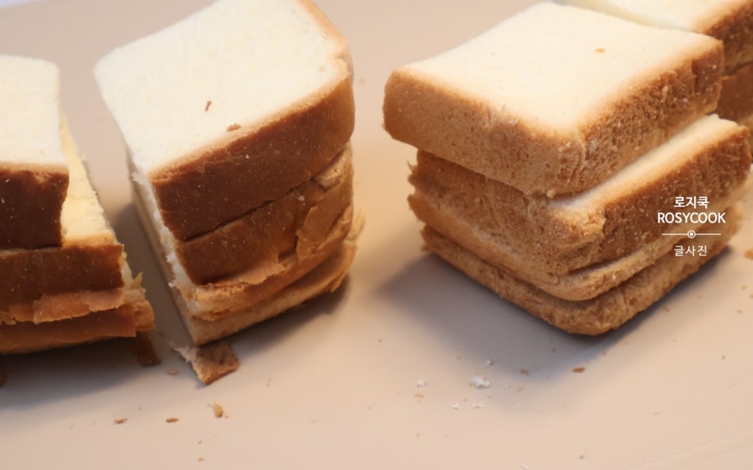 1. 먼저 식빵을 갈기 좋게 썰어줍니다. 샌드위치용 식빵을 사용해 봤습니다.