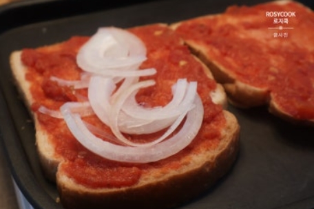 5. 식빵에 토마토소스를 펴 발라줍니다.