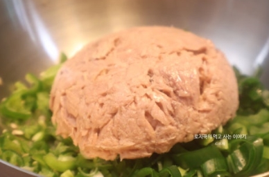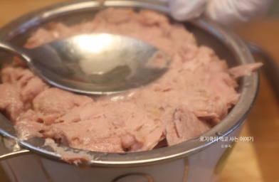 5. 참치캔의 기름을 쫙 빼서 넣어줍니다.