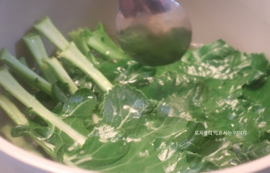 10. 케일을 넣고, 1분 정도 데쳐줍니다. 찬물에 담가서 헹궈준 후, 물기를 꽉 짜서 준비해 줍니다.