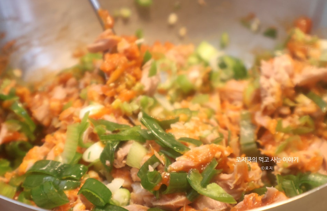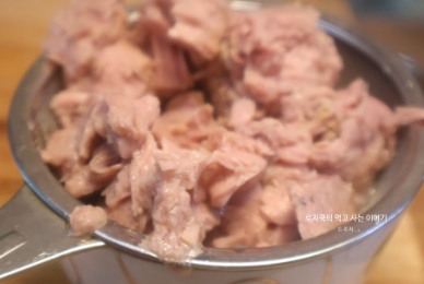 5. 참치캔의 기름을 쫙 빼서 넣어줍니다.
