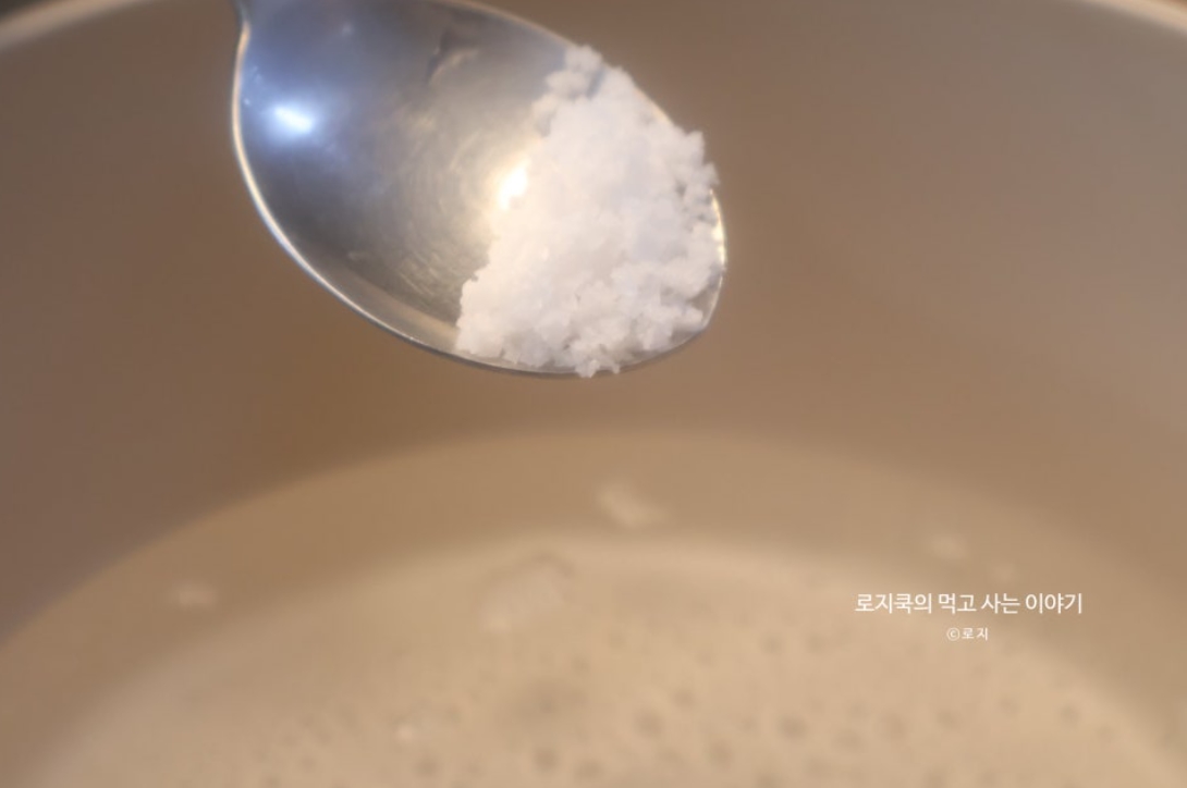 9. 끓는 물에 소금 1/3 큰 술을 넣어줍니다.