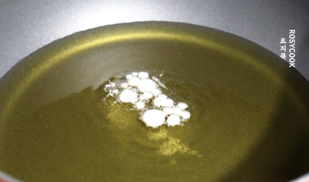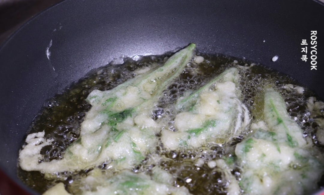튀김반죽을 떨어뜨려봤을 때 3초 정도 후에 떠오르면 적정 온도가 된 겁니다.
