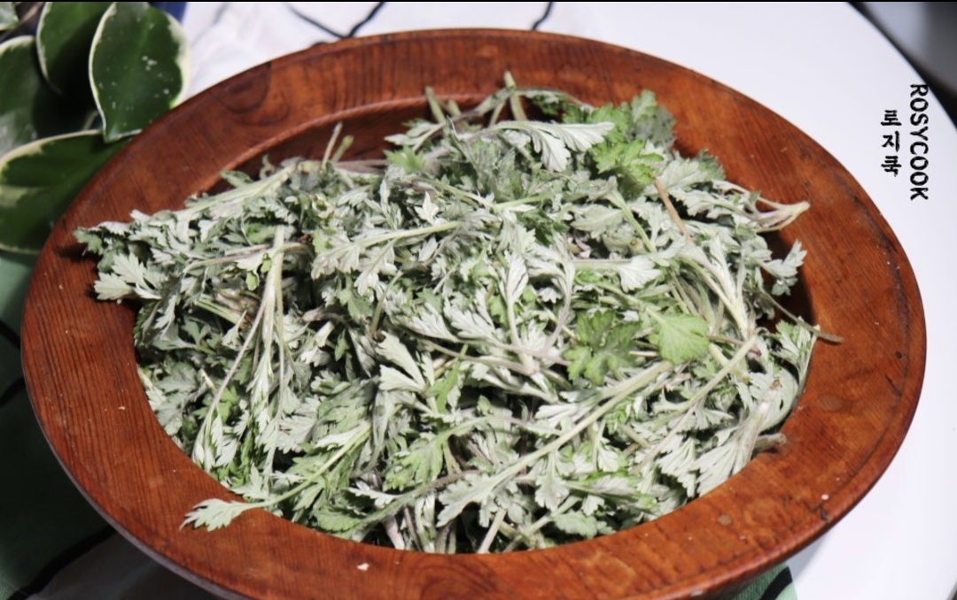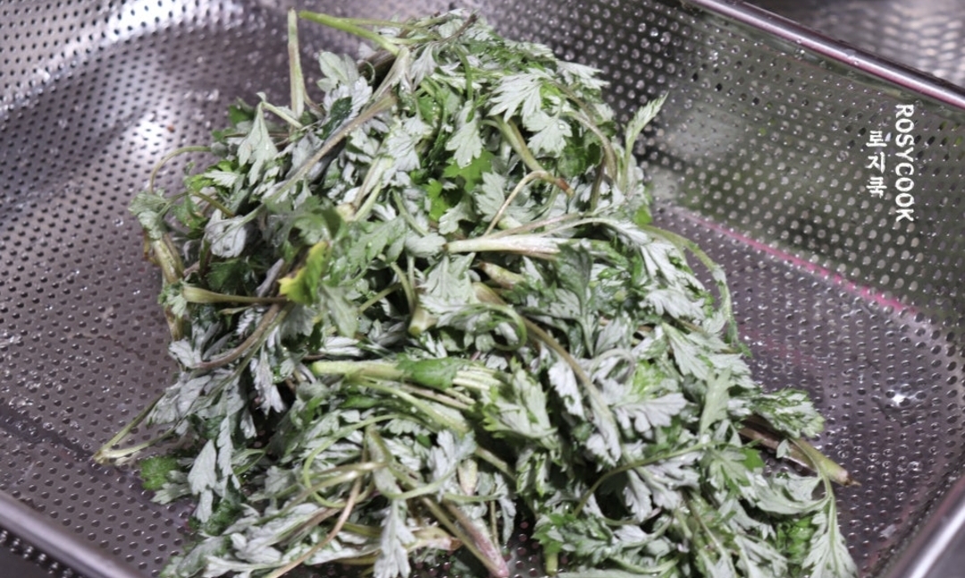 2. 쑥을 흐르는 물에서 세척해 준 후, 체에 밭쳐서 물기를 빼줍니다.