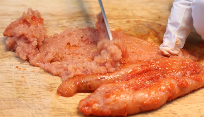3. 명란젓을 반으로 갈라준 후, 속을 긁어서 준비해 줍니다.
