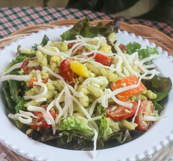9. 그릇에 쌈 채소를 깔아준 후, 만들어둔 아보카도 파스타를 올려주세요. 마무리로 모짜렐라 치즈를 뿌려줍니다.