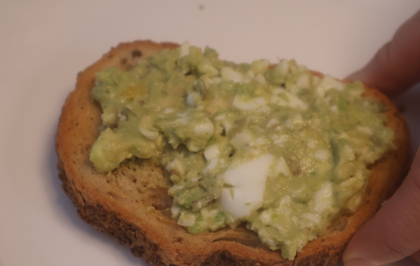 6. 호밀빵을 에어프라이어에 바삭하게 구워서 준비한 후, 준비해둔 계란 아보카도를 펴발라가며 올려줍니다.