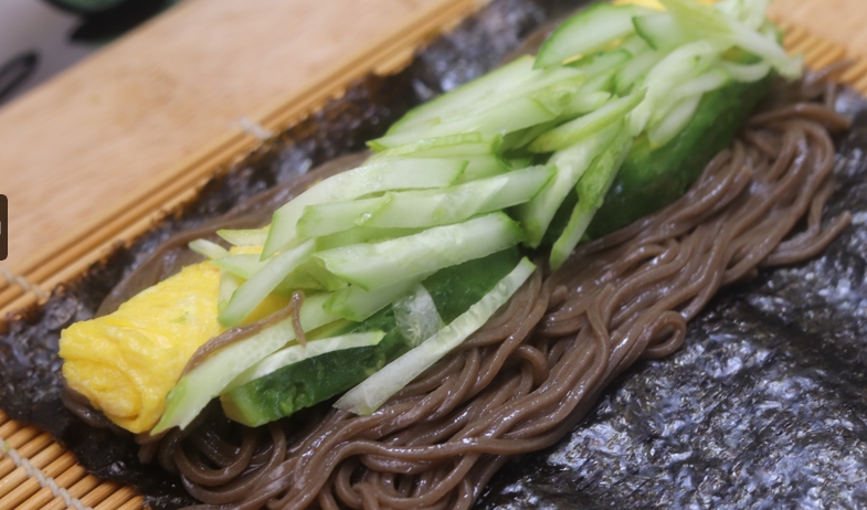 밥 대신 메밀면을 넣은 김밥 입니다. 메밀의 풍미와 부드러운 아보카도의 조합이 좋은 레시피로 담백하게 즐기기 좋습니다.