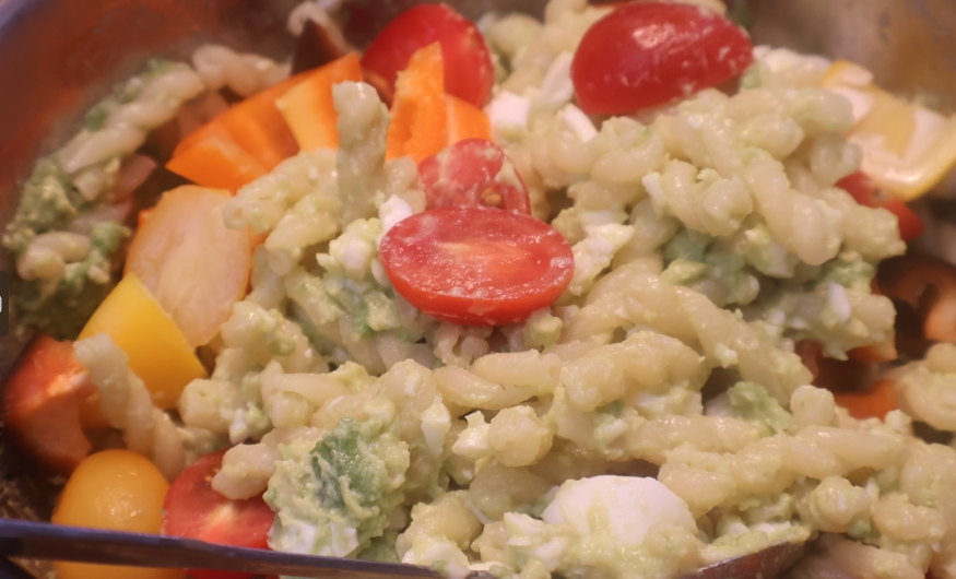 7. 으깬 아보카도 삶은 계란에 삶은 파스타를 넣고 아보카도오일을 넣어줍니다.