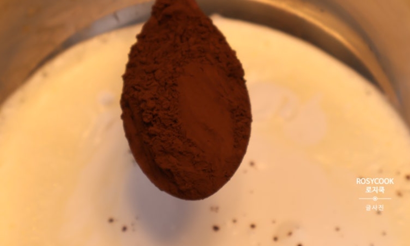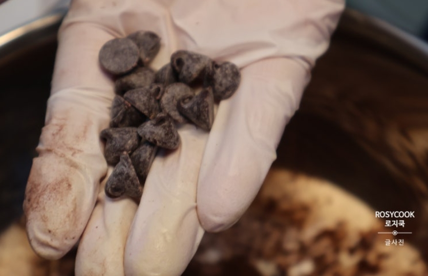 11. 초콜릿 칩을 넣어줍니다. 초코칩이 녹지 않고 씹히는 식감이 있게 하려면 우유가 좀 식은 상태에서 넣어주시는 게 좋습니다.