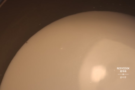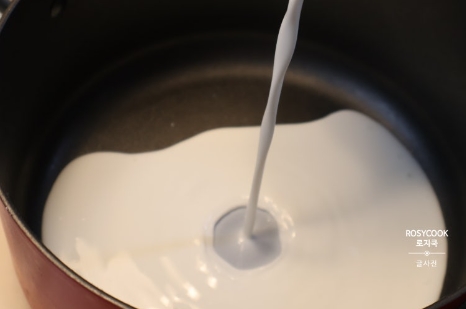 5. 냄비에 우유를 부어줍니다. 펄펄 끓어오를 때까지 끓이지 마시고 가장자리에 기포가 생길 때까짐나 데워줍니다.