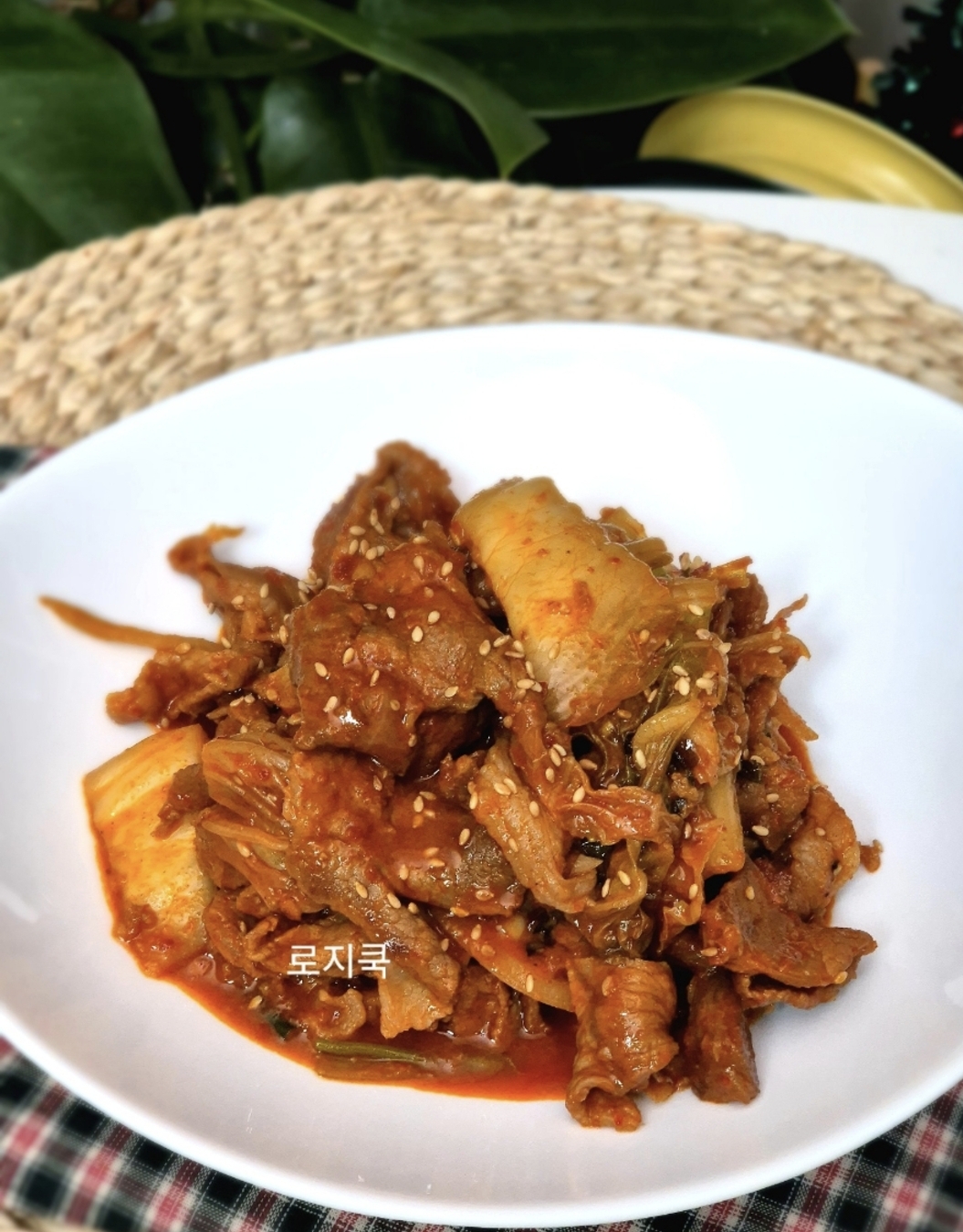 드디어 고춧가루·고추장·김치 두루치기 스타일의 앞다리살 제육볶음이 완성되었습니다. 어렵지 않죠?