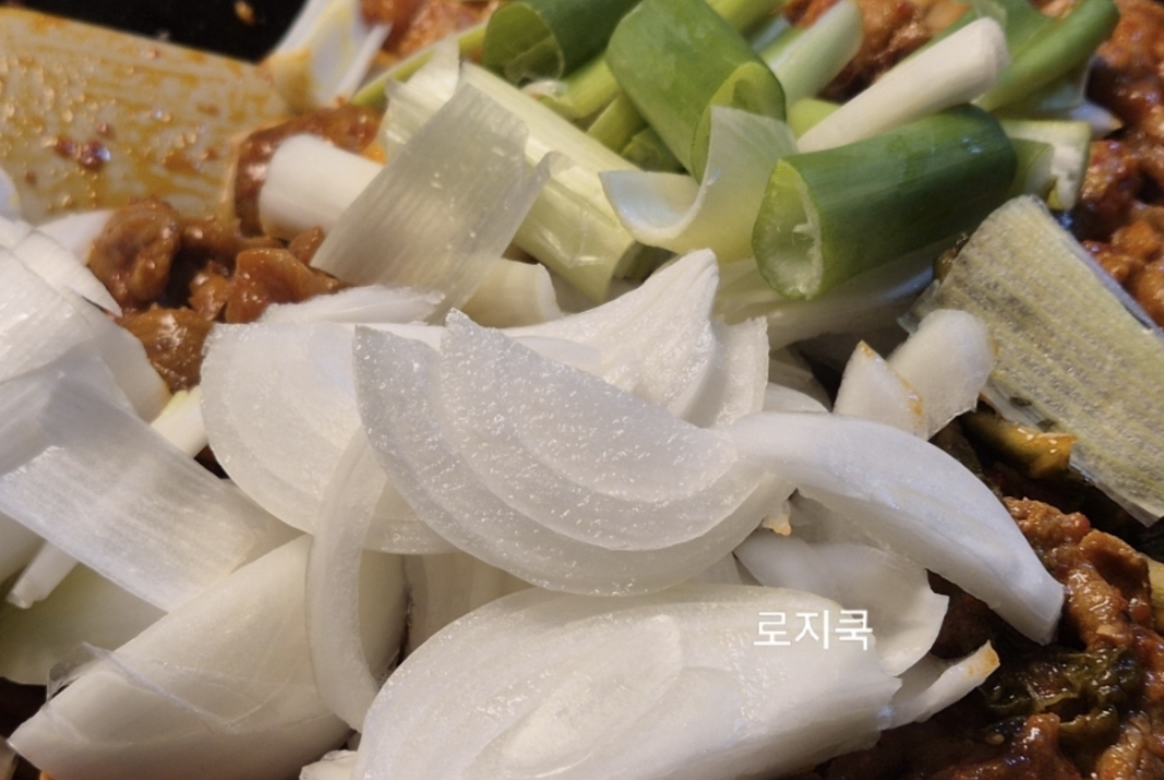 고기가 반쯤 익으면 양파와 대파를 넣어 향을 더합니다.
