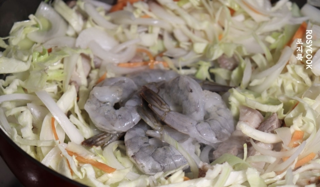 15. 양배추를 넣어주시고, 해동해둔 칵테일 새우 6마리도 넣어줍니다.