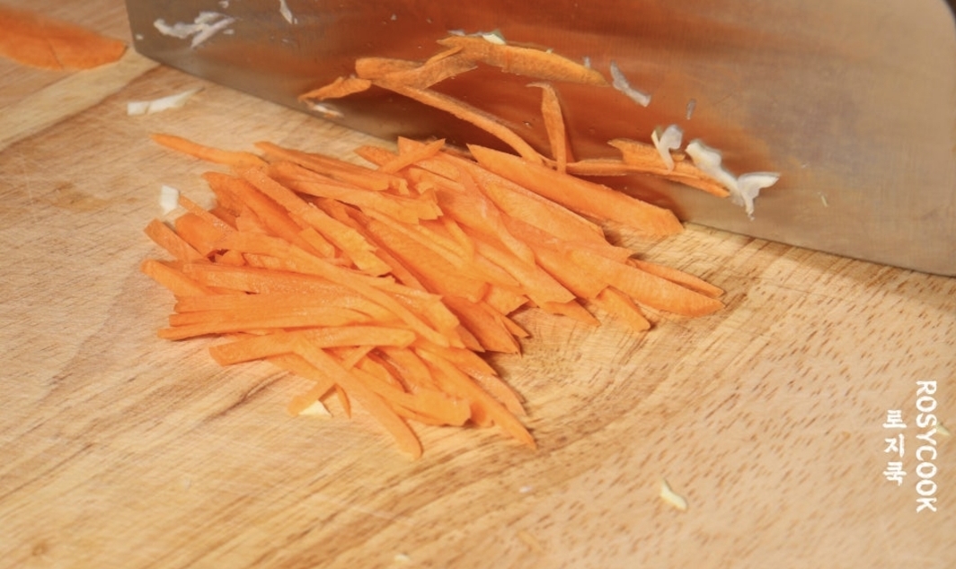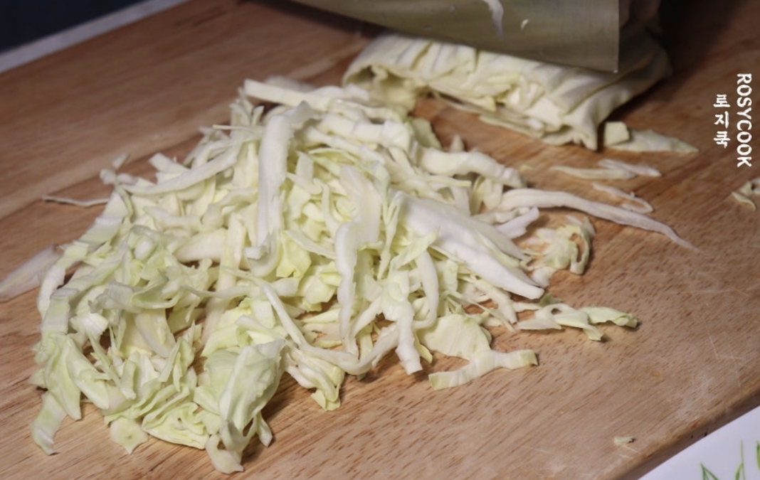 1. 양배추는 1줌 정도 나오게 채 썰어주고, 당근은 1/3개 채 썰어줍니다.