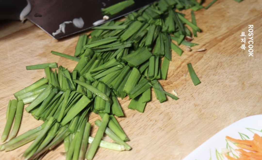4. 부추는 반 줌 정도 나오게 2cm 정도의 크기로 썰어줍니다.