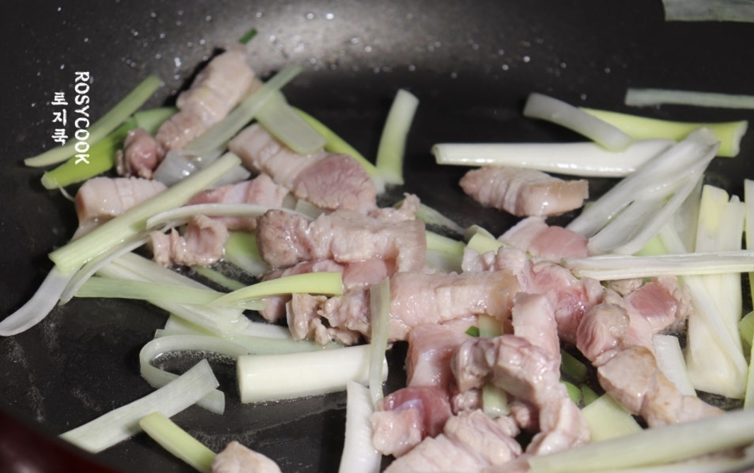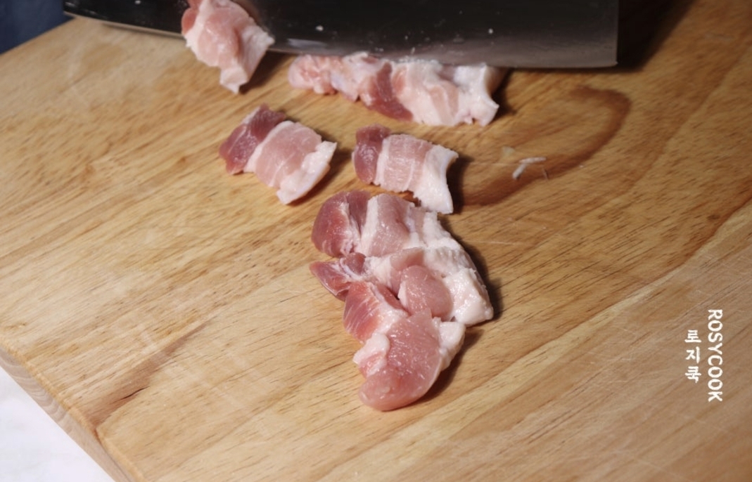6. 삼겹살 150g을 먹기 좋은 크기로 썰어줍니다. 꼭 삼겹살이 아니어도 됩니다.