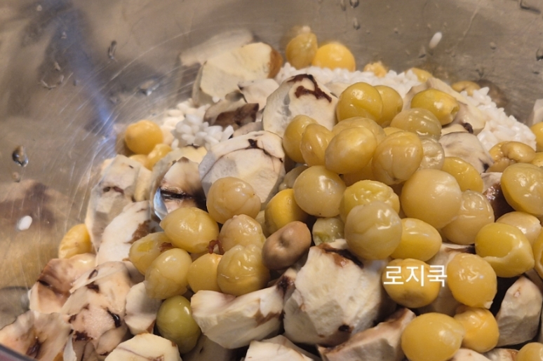 전기 압력밥솥에 불린 찹쌀을 먼저 넣고, 그 위에 밤·은행·대추를 올립니다. 이어서 물, 흑설탕, 진간장, 소금, 계핏가루를 넣고 잘 섞어줍니다.