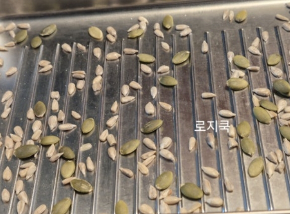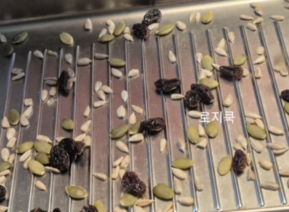 호박씨, 해바라기씨, 건포도를 넣어 골고루 섞습니다. 건포도는 너무 오래 익히면 식감이 무르기 때문에 이 단계에서 넣는 것이 좋습니다.