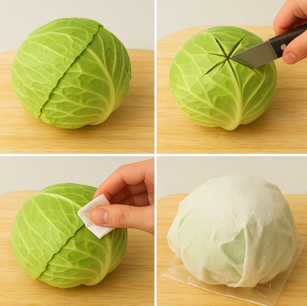 이 방법은 양배추가 건조해지거나 갈변되는 것을 방지해 최대 2~3주간 신선도 유지에 효과적입니다.