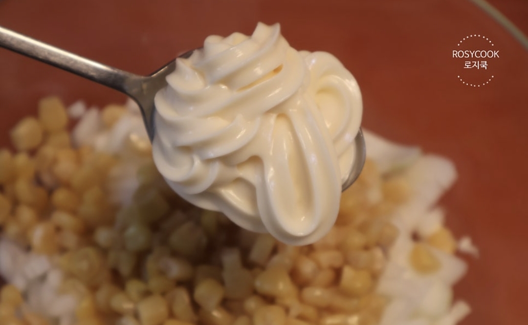 4. 캔옥수수의 국물을 뺀 후, 3 큰 술을 넣어줍니다. 마요네즈 4 큰 술도 넣어줍니다.