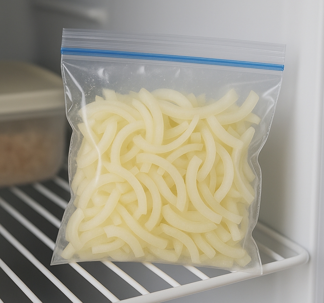 사용하기 편하게 채 썬 후 소분해서 지퍼백이나 밀폐용기에 담아 냉동실에 보관하면 1개월 정도까지 사용할 수 있어요. 해동 없이 바로 팬에 넣어 조리하면 끝!