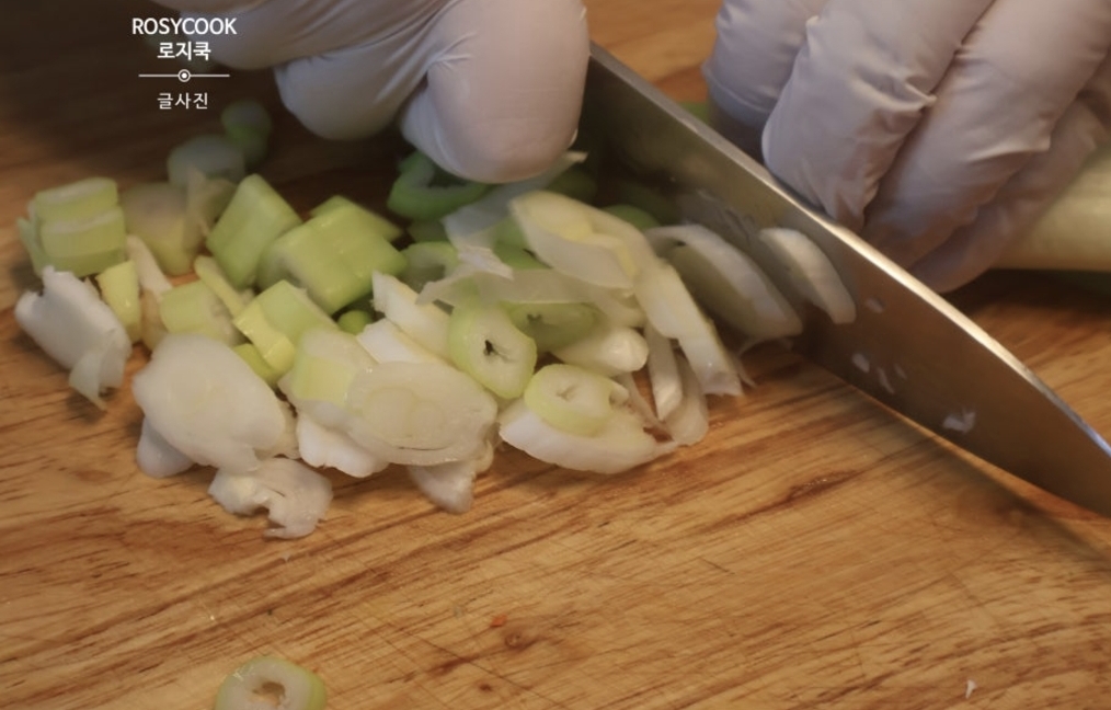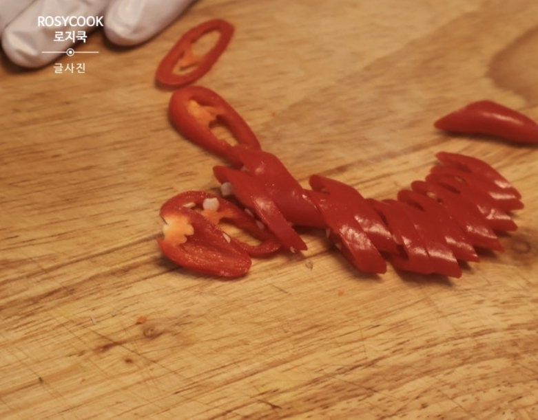 홍고추는 어슷썰기, 대파는 송송 썰어 준비합니다.