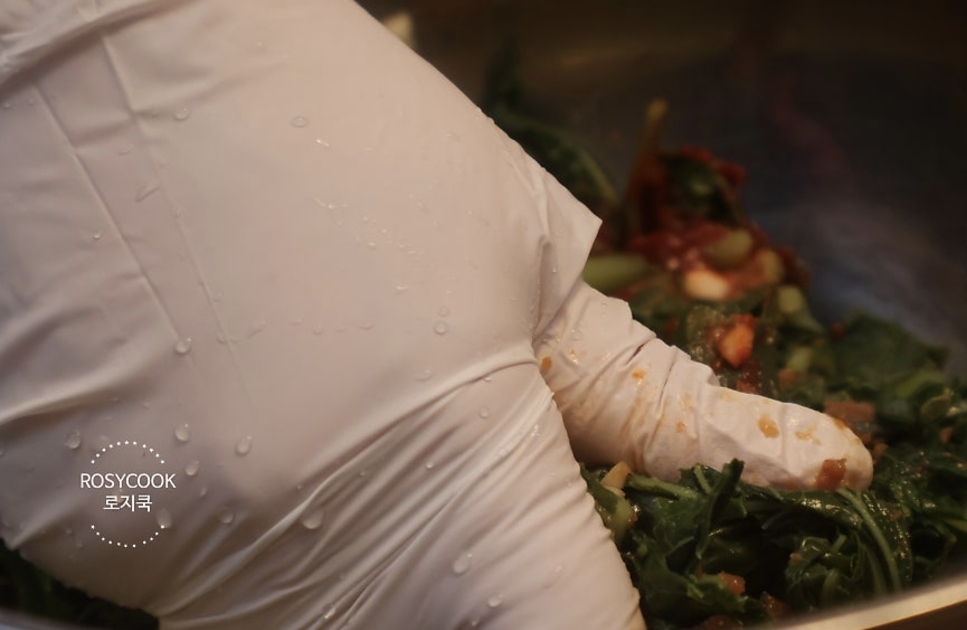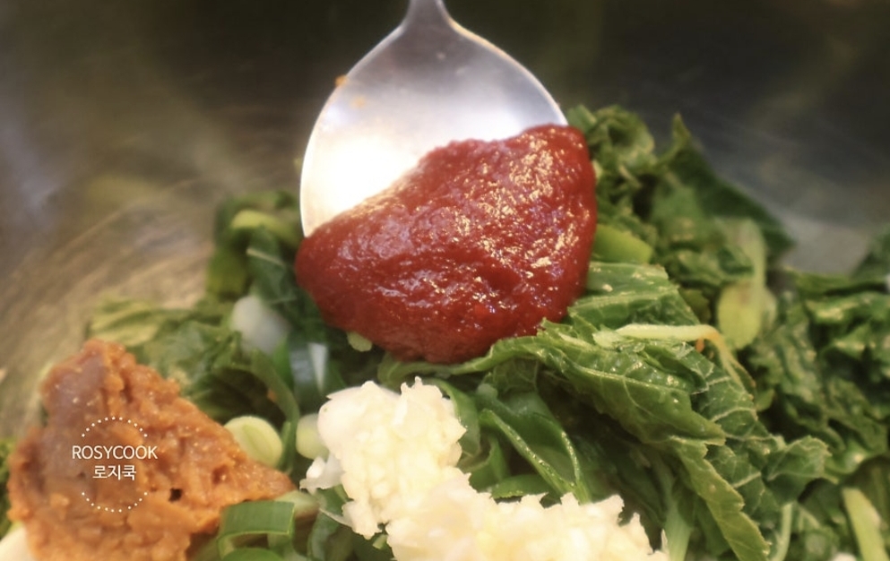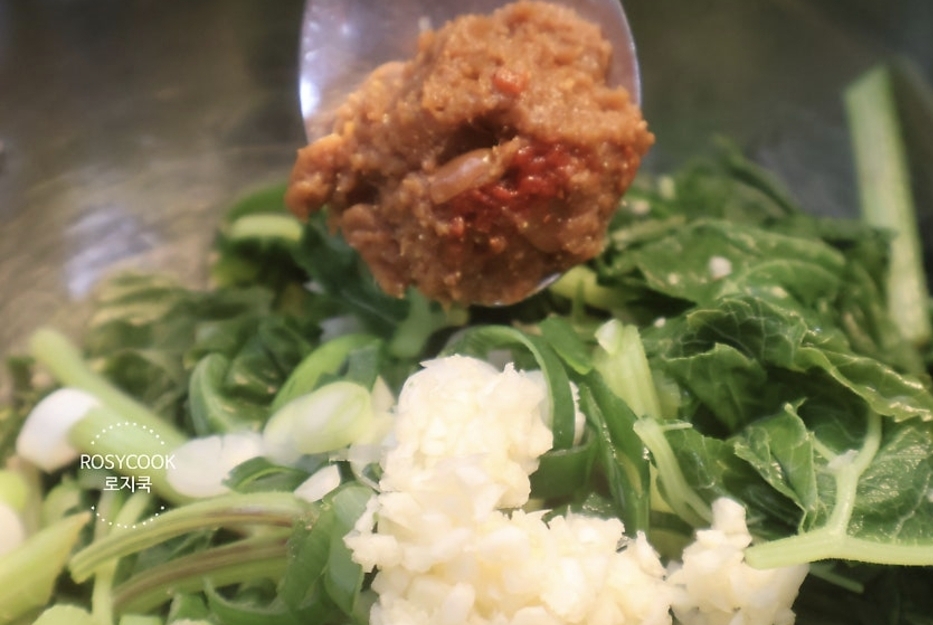 볼에 어수리와 대파를 넣고, 간 마늘, 된장, 고추장을 각각 1/2 큰 술씩 넣어줍니다. 양념이 배도록 한 번 조물조물 무쳐줍니다.
