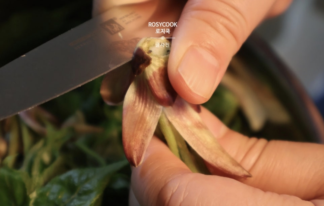 1. 먼저 엄나무순을 다듬어줄 겁니다. 먼저 엄나무순의 끝부분에 있는 갈색 껍질을 칼로 똑 떼줍니다.