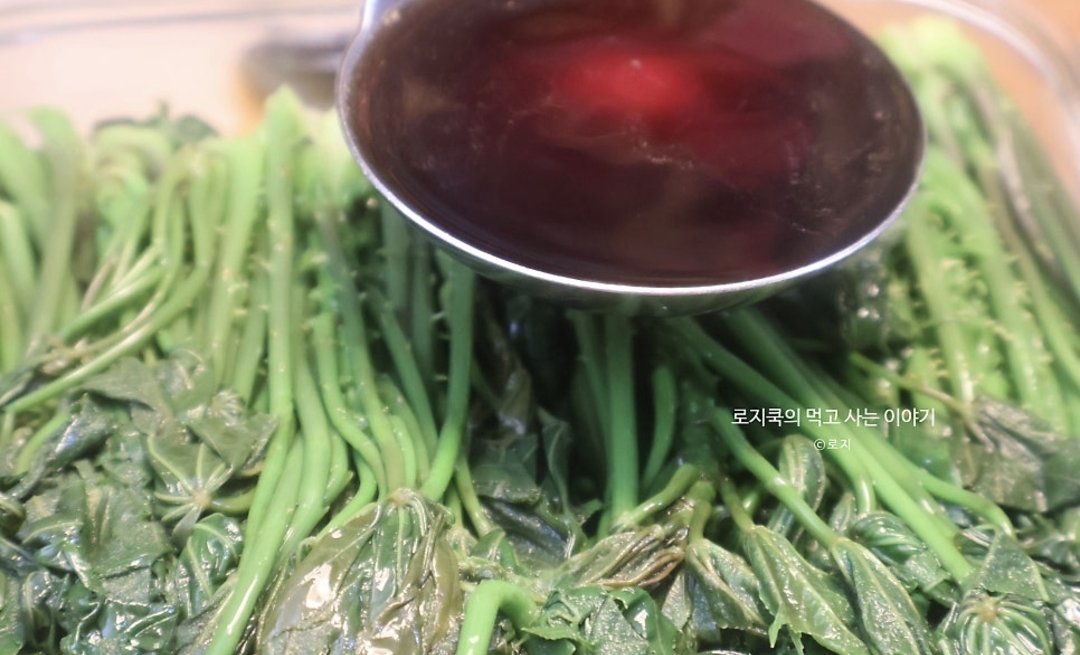 뜨거운 간장을 부으면 엄나무순이 흐물흐물해질 수 있어요.