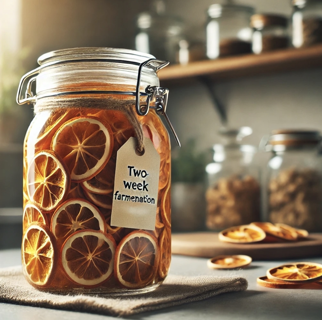 2. 말린 껍질을 식초와 함께 유리병에 담아 2주간 숙성시킵니다.