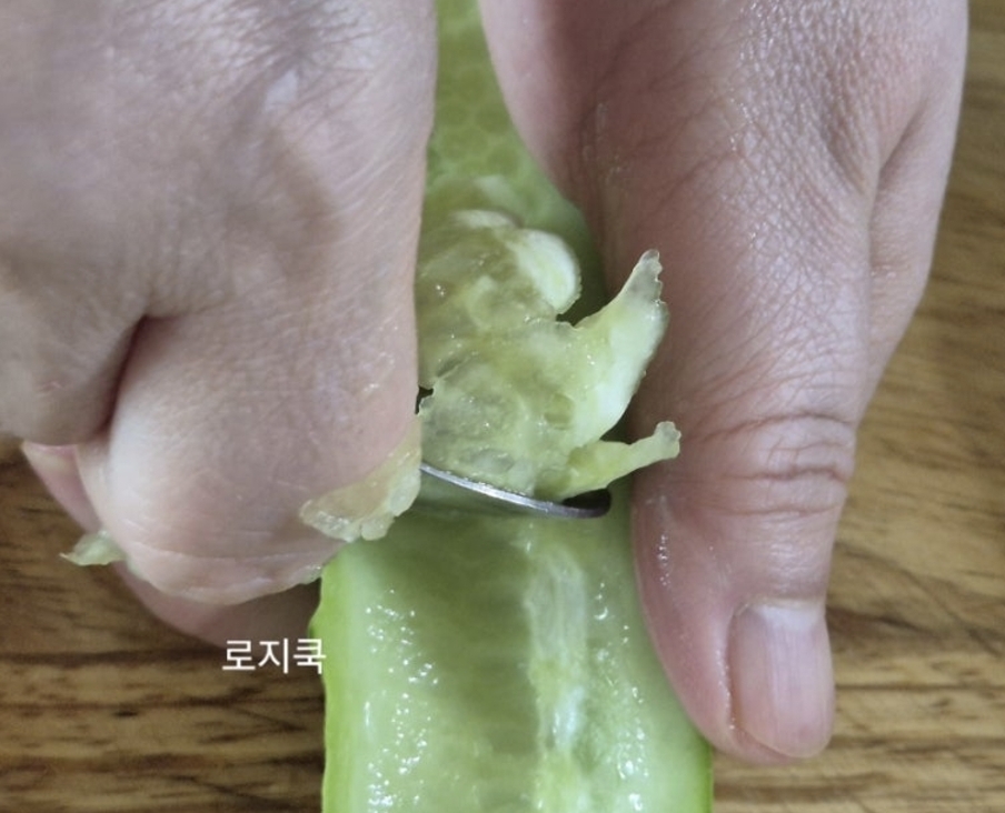 양끝을 살짝 자르고, 길게 반 갈라 씨 부분을 커피숟가락으로 파주세요.