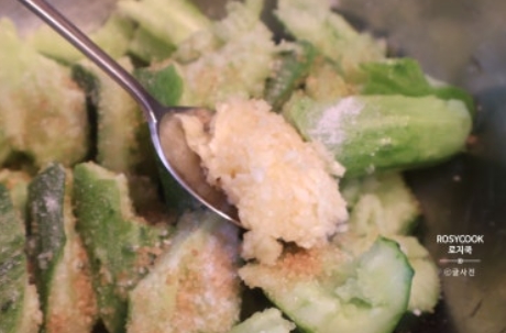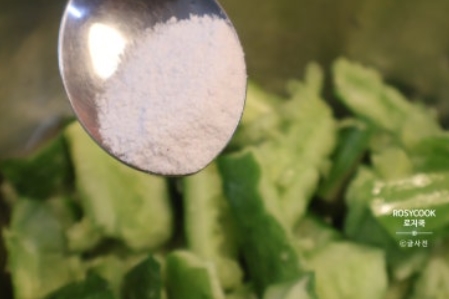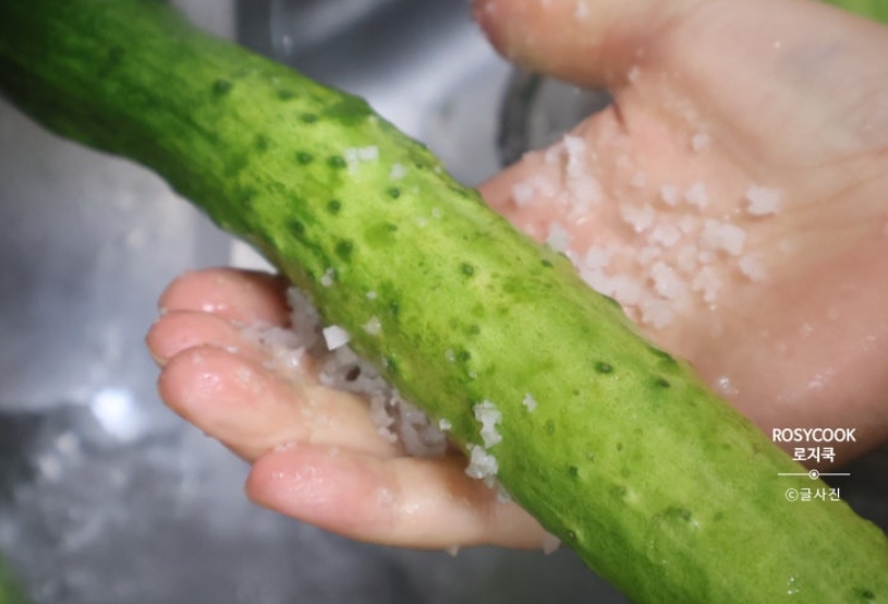 1. 오이를 굵은 소금으로 문질러서 매끄럽게 만들어줍니다. 흐르는 물에서 세척해 줍니다.