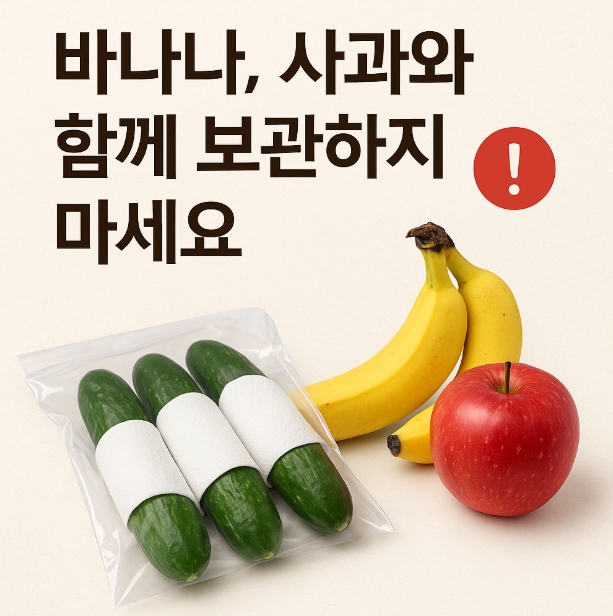 - 다른 과일, 채소(특히 사과, 바나나)와 너무 가까이 두지 않는 것이 좋아요. 이들은 에틸렌가스를 방출해 오이 숙성을 촉진할 수 있습니다.