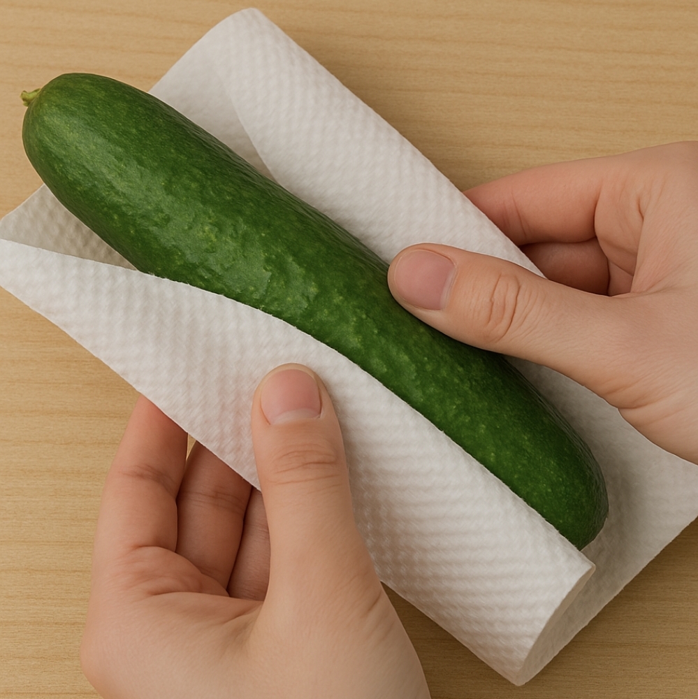 Tip : 키친타월이 수분을 흡수해 오이가 무르지 않고 신선함을 유지할 수 있어요.