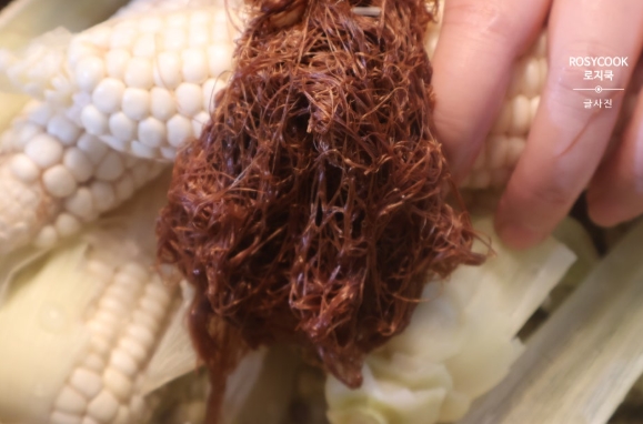 이 옥수수수염은 나중에 찔 때 함께 넣어주면 구수한 향과 풍미를 더해줘요. 껍질째 흐르는 물에 옥수수를 깨끗이 씻어주세요. 모아둔 수염도 함께 세척해서 준비합니다.