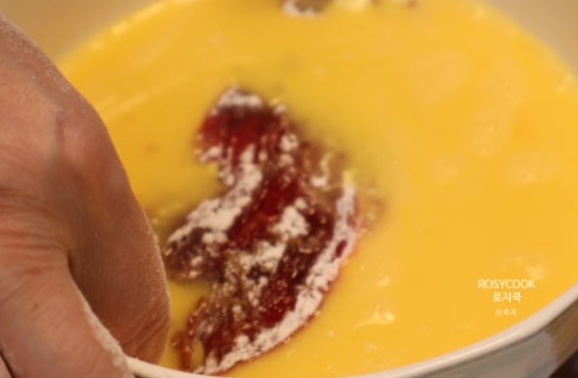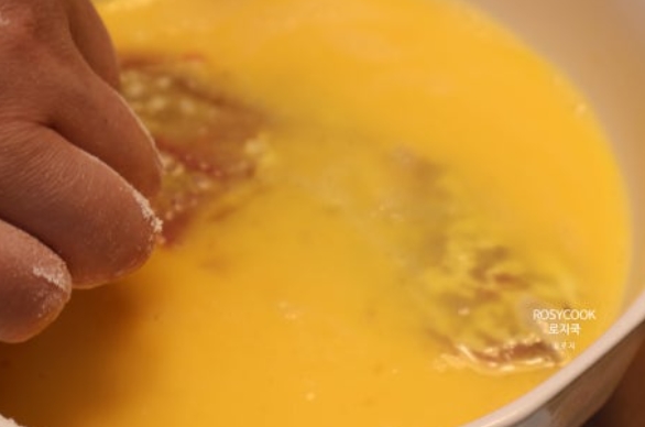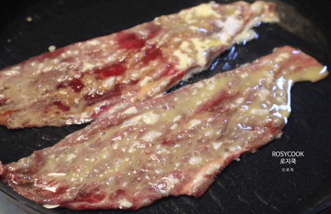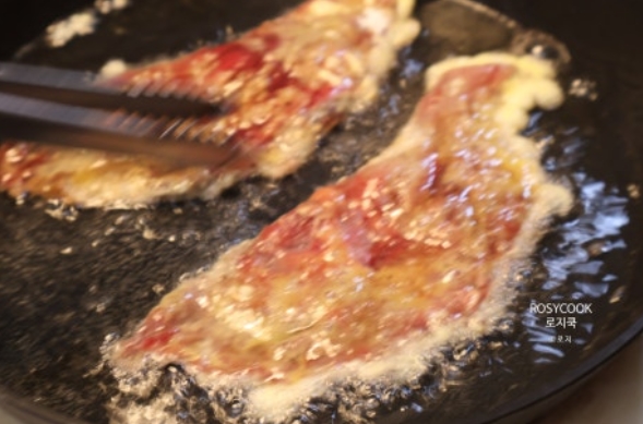 8. 풀어둔 계란에 담가주시고, 예열된 팬에 올려줍니다. 약불에서 천천히 조리해 줍니다. 이렇게 고기가 쪼그라들면 익은 겁니다. 뒤집어서 나머지를 구워주시면 됩니다. 고기가 얇아서 오래 익힐 필요가 없습니다.