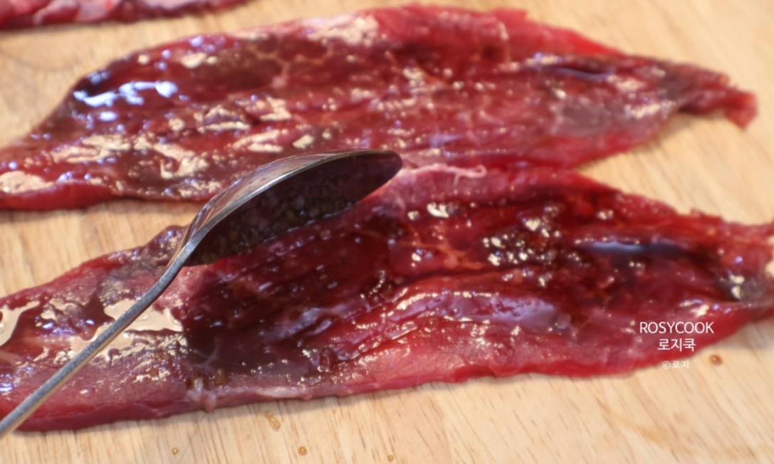 5. 숟가락으로 힘줄 부분을 탁탁 쳐서 끊어주면 양념이 더 잘 배고 육질이 부드러워집니다.