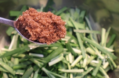 12. 고춧가루를 취향껏 넣어주고, 참기름, 깨를 둘러줍니다. 조물조물 무쳐줍니다.
