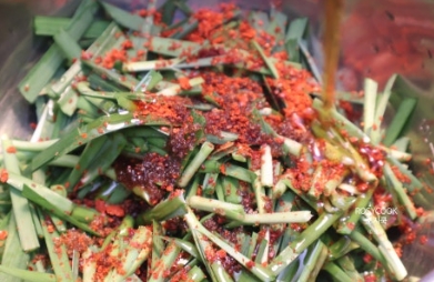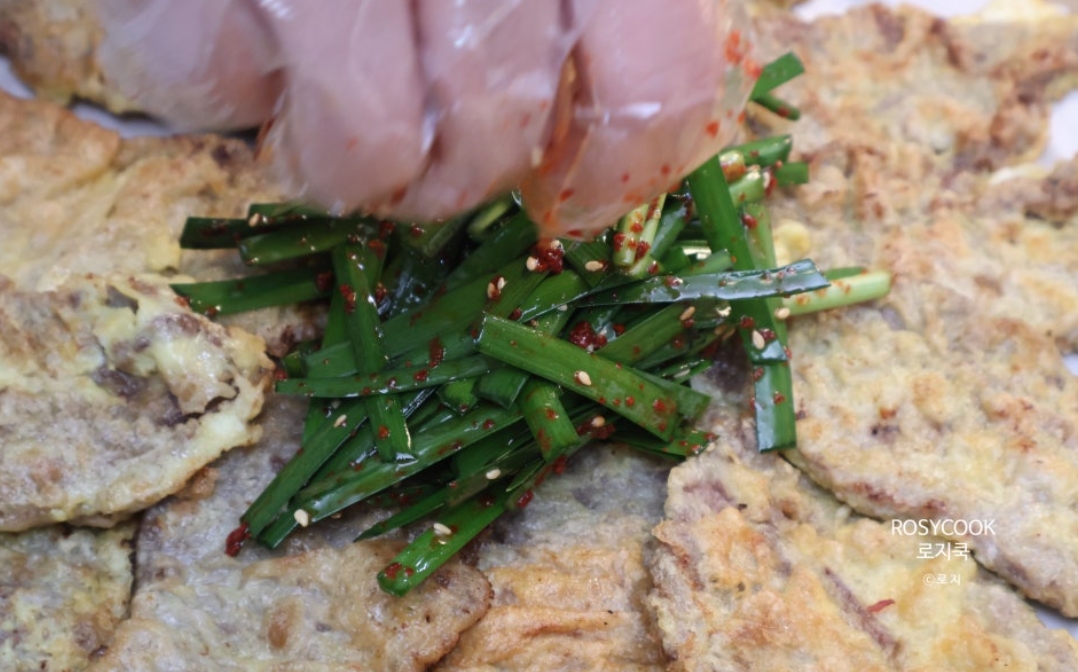 13. 육전 가운데에 부추무침을 올려서 마무리합니다.