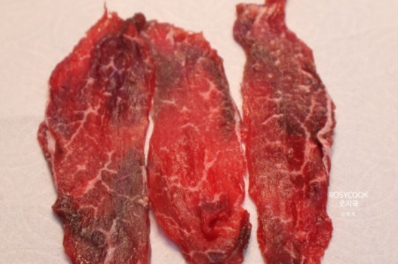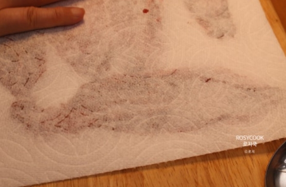 2. 육전 고기 부위는 소고기 설도를 사용했습니다. 설도를 키친타월에 꾹꾹 눌러 핏물을 제거해 줍니다. 불고기용 소고기 아무거나 사용하시면 됩니다.