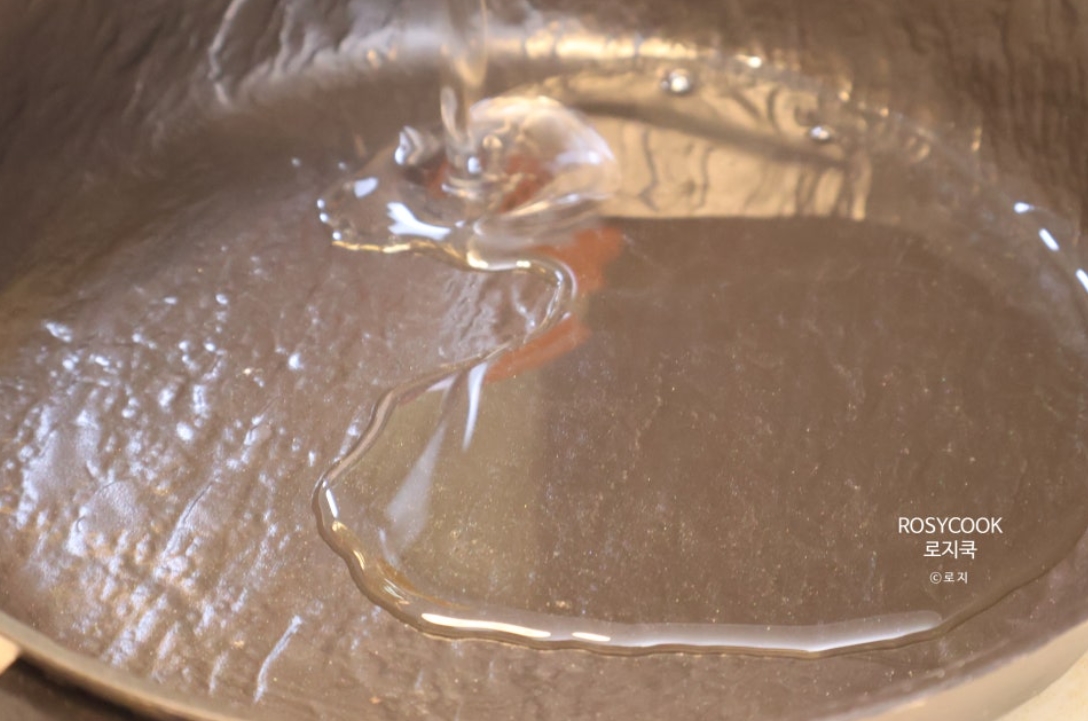 7. 팬에 식용유를 전체적으로 넉넉하게 둘러준 후, 예열해 줍니다.