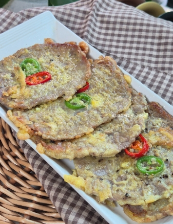 얇게 저민 소고기를 부침가루와 계란옷을 입혀 노릇하게 구워낸 육전은 남녀노소 누구나 좋아하는 담백하면서도 고소한 메뉴죠.